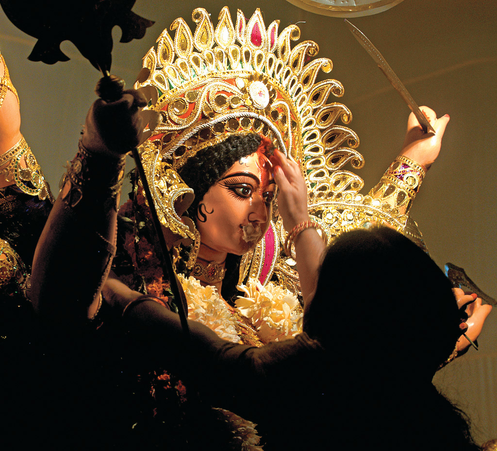 The clay idols, dressed up in colourful cloth and glittering gems, brandishing an assortment of articles such as weapons of war and musical instruments, are not less than six feet in height. They look formidable when mounted on raised platforms inside the pandals. The visages of the deities vary according to the imagination of the sculptors, who customise the idols as per the specifications of the puja organisers. There have been instances when Durga’s face was made to resemble popular movie heroines or even female political figures. The demon’s head too has many a times been made to resemble unpopular public figures.